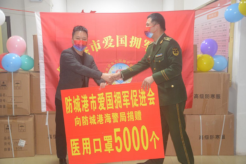 座談會(huì)結(jié)束后,愛(ài)國(guó)擁軍促進(jìn)會(huì)向武警和海警部隊(duì)進(jìn)行了愛(ài)心物資捐贈(zèng)。吳瑋君會(huì)長(zhǎng)代表協(xié)會(huì)捐贈(zèng)軍大衣100件、春聯(lián)100副;彭大權(quán)常務(wù)副會(huì)長(zhǎng)代表協(xié)會(huì)向防城港海警局捐贈(zèng)醫(yī)用口罩5000個(gè)。
